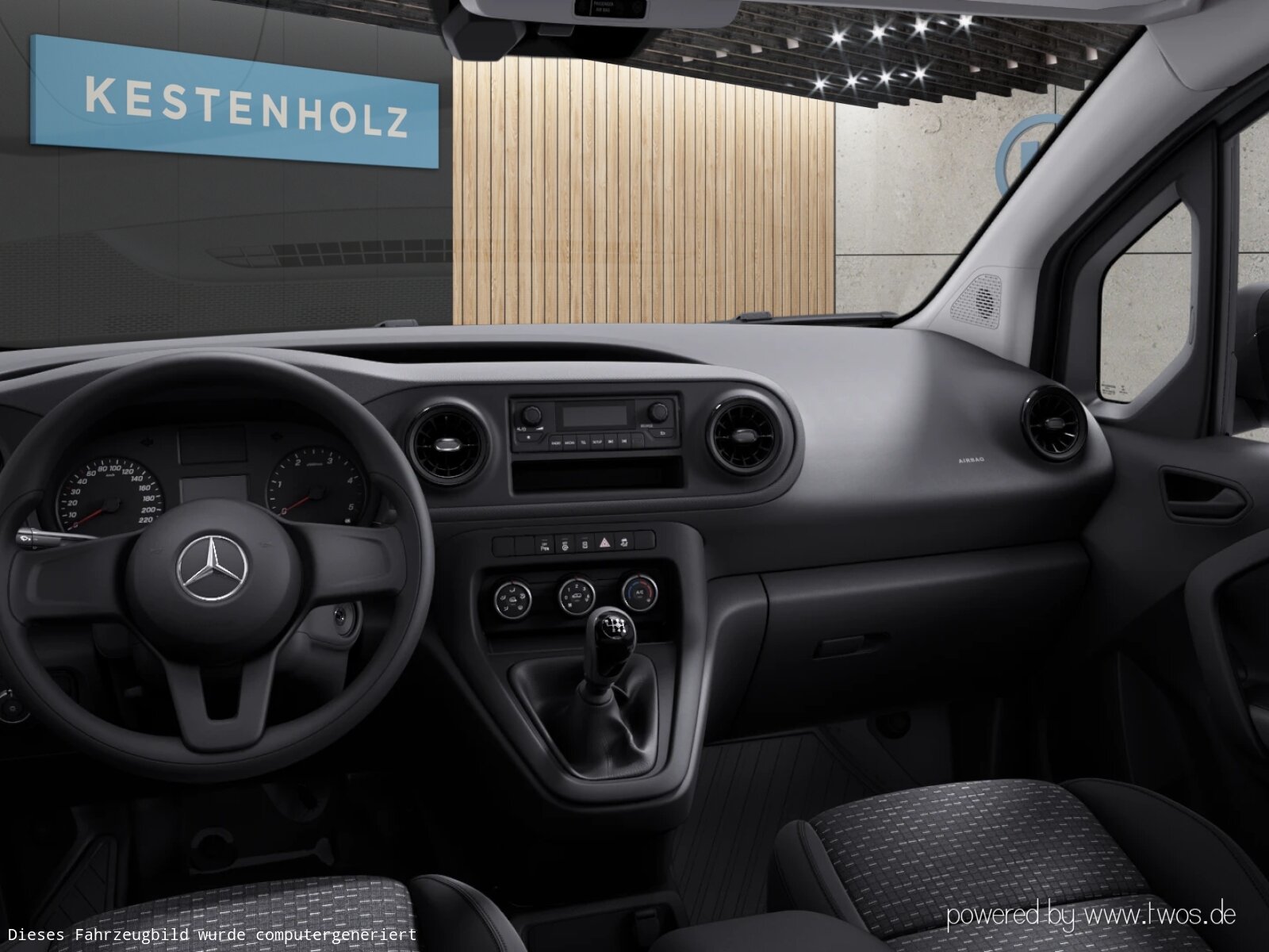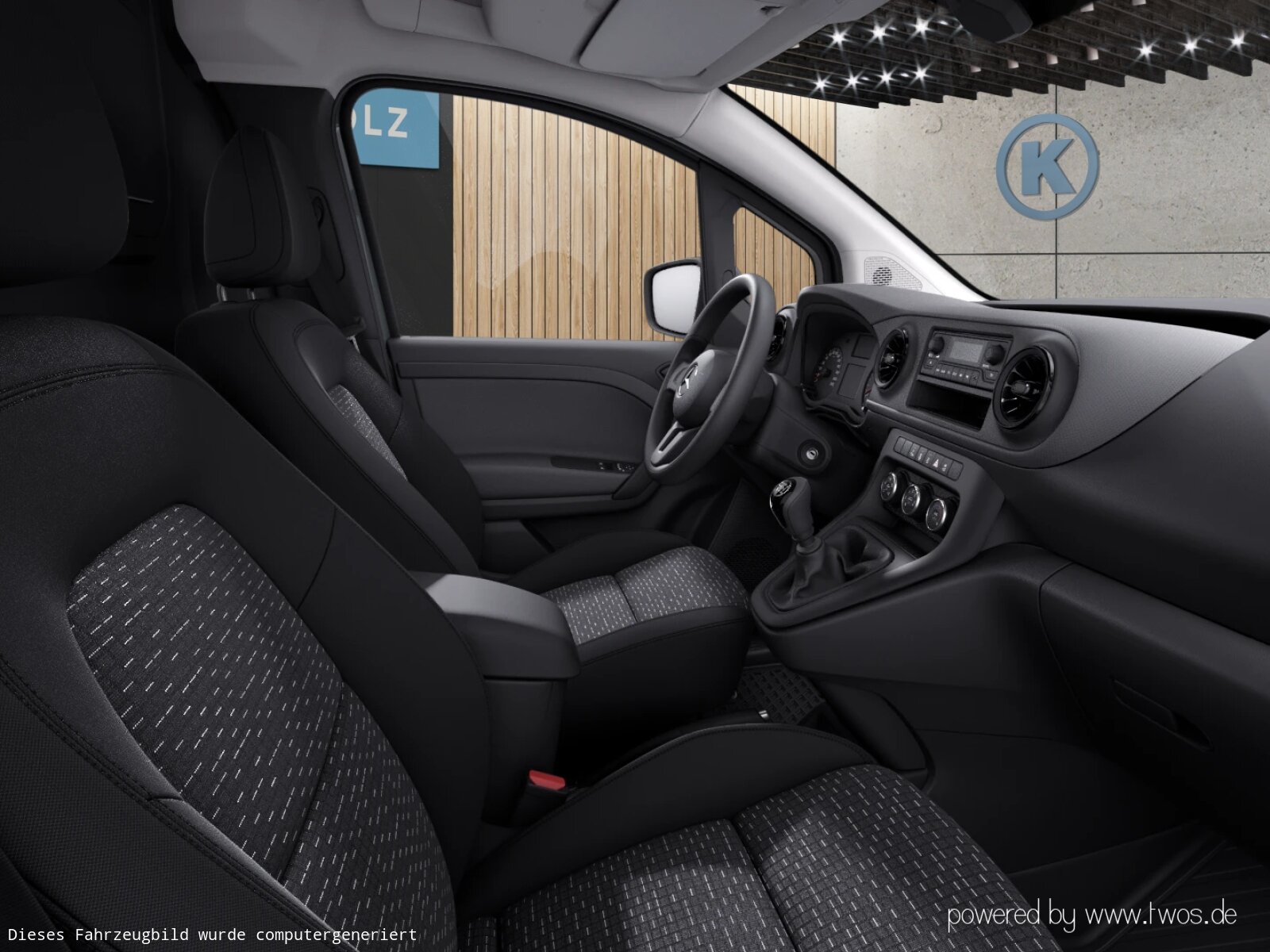 Klimaanlage: Kraftstofffilter mit Wasserabscheider, Kunststoffboden im Fahrgastraum vorn, Lenkrad ohne Multifunktionstasten, Lenkrad umschäumt, Linkslenker, Mittelarmlehne und Türfelder schwarz genarbt, Ohne Ambientenbeleuchtung, Ohne beheiztes Lenkrad, Ohne Belüftungsdüsen im Fond, Ohne Fenster SW/LST m. Fensterheber elektr., Ohne Innenraumspiegel, Ohne Innenspiegel, Ohne Lastschutznetz, Ohne Rücksitzbank, Ohne Sitze in Reihe 3, Ohne Sitzheizung vorn, Ohne Sitz in Reihe 2, Ohne Sitz Mittelgurt Fond, Ohne Tasche an Fahrer- und Beifahrerrückenlehne, Ohne Tempomat, Ohne Warmluftkanal zum Fahrgastraum, Ohne Zierelemente, Schaltknauf Kunststoff, Sitzbezugsart Stoff, Start über Zündschlüssel, Stoff Caluma schwarz, Tachometer km/h,