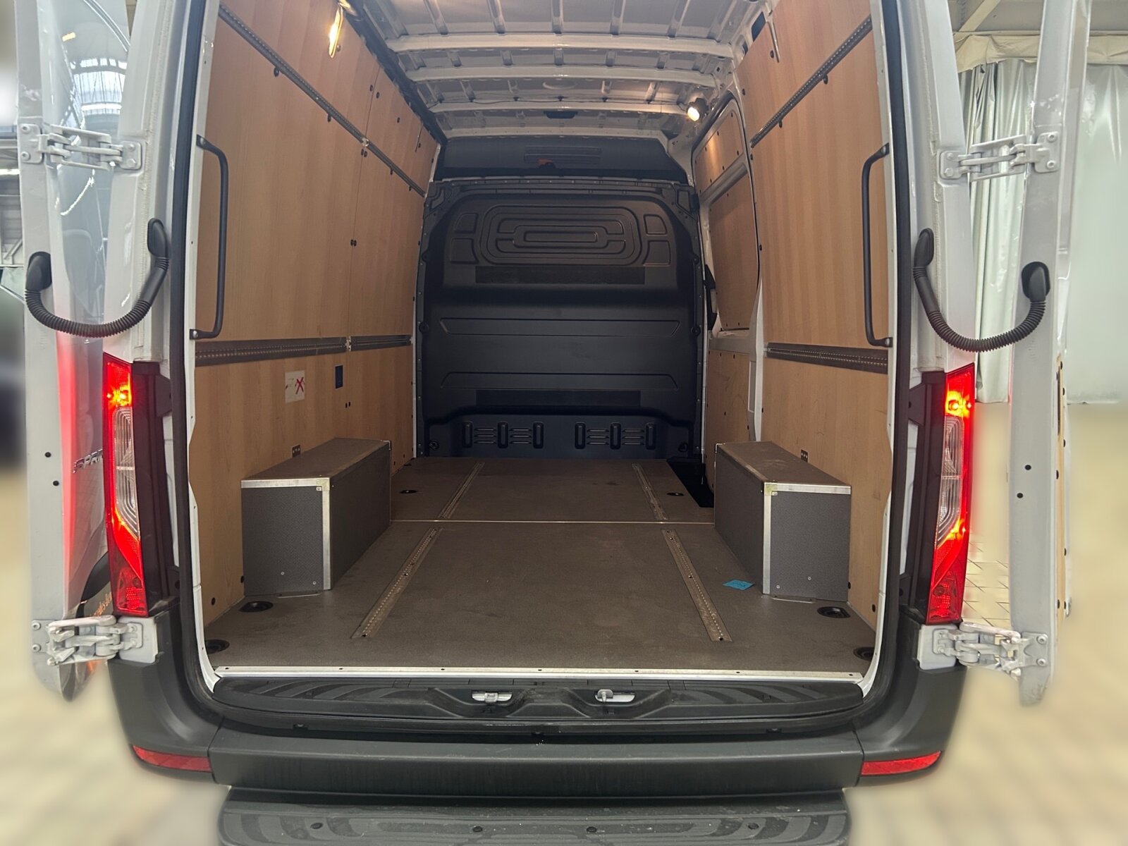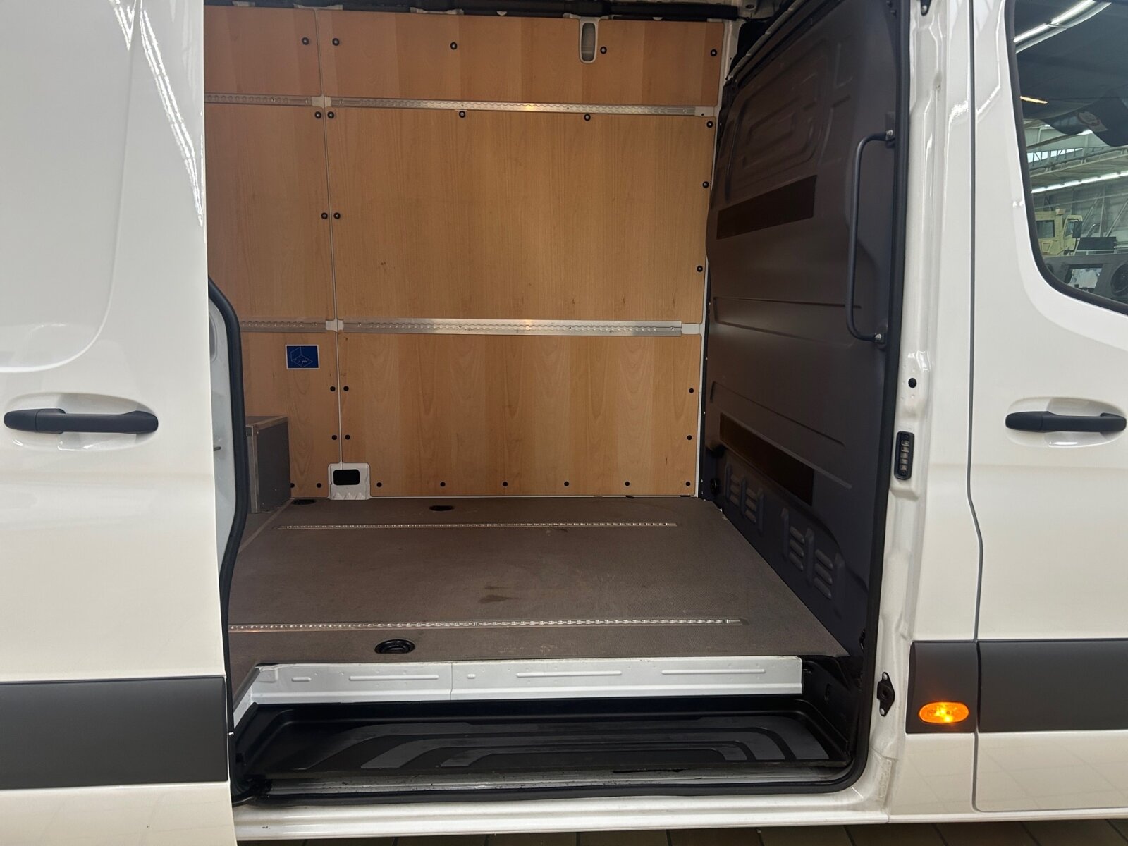 Beifahrersitz Zweisitzer: Deckenleuchte(n) LD-/FG-Raum mit Türkontakt, ECE-Ausführung, Einstieggriff an Ecksäule hinten rechts, Fahrersitzkasten, niedrig, Haltegriffe für Einstieg Fahrer und Beifahrer, Holzfußboden, Innenverkleidung Laderaum bis Dachhöhe (Holz), Klappdeckel für Ablagefach, Laderaumbeleuchtung über Bewegungsmelder, Lastenverankerungsschienensystem, Leitungskanal an Seitenwand, Linkslenker, Radkasten beladbar,
